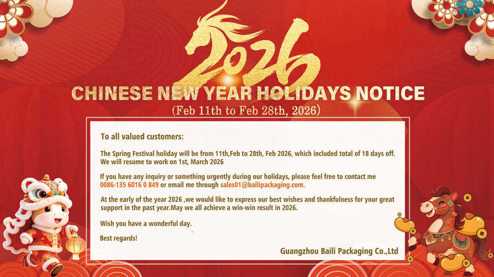 If you have any inquiry or something urgently during our holidays, please feel free to contact me 0086-135 6016 0 849 or email me through sales01@bailipackaging.com.